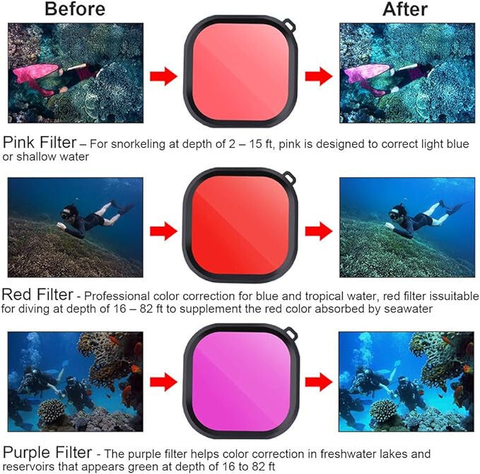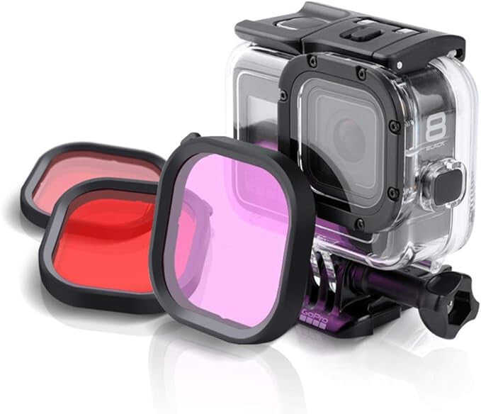 KOMPATIBILITÁS - Csak a GoPro Hero 8 Black hivatalos vízálló tokjához alkalmas. Kérjük, ne telepítse más vízálló tokokra. A piacon különböző verziójú vízálló tokok találhatók. Annak érdekében, hogy a megfelelő méretű szűrőt vásárolja meg, kérjük, hasonlítsa össze a különböző tokokat a képek alapján.
