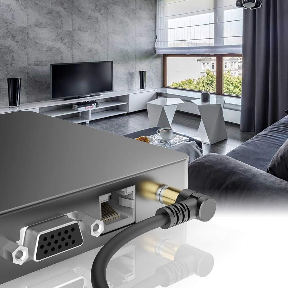 - A kábel oxigénmentes réz (OFC) vezetőmaggal készül, amely alacsony veszteségű, megbízható jelátvitelt biztosít. A többrétegű árnyékolás hatékony védelmet nyújt az elektromágneses és nagyfrekvenciás zavarokkal szemben. A 90°-os (derékszögű) apa csatlakozó helytakarékos kialakításának köszönhetően ideális falhoz közeli TV-k és szűk helyek esetén.