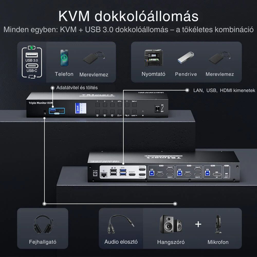 - TESmart MST KVM Dokkolóállomás 3 Monitorhoz, 4K 60Hz, EDID - 1 Laptop + 3 Számítógép