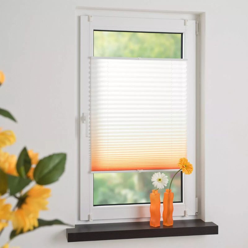 Modern aussehend, 110 x 130 cm Plissees in der Größe orangefarbener Farbverlauf im Design. DER halbtransparentes Polyestermaterial Es sorgt für eine angenehme Lichtdurchlässigkeit und wahrt gleichzeitig die Privatsphäre. Ohne Bohren, mit Cliphalterungen kann an PVC-Fensterrahmen befestigt werden. DER für stufenlos verstellbare Bedienschienen Dank dieser lässt sich die Lichtmenge einfach regulieren. Eine stilvolle, praktische und einfach zu installierende Lösung für jedes Fenster.