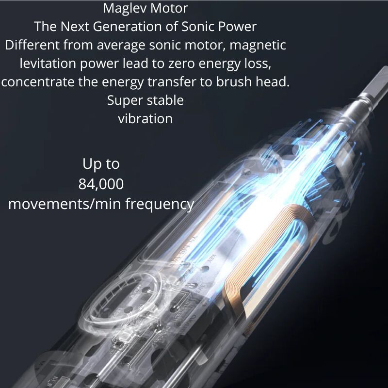 Das Gerät ist starkMagnetschwebebahn-Motorsogar84.000 Schwingungen pro MinuteBietet eine gründliche Reinigung, die Plaque und Speisereste entfernt und gleichzeitig Ihr Zahnfleisch schont. Die Wirksamkeit der Schalltechnologie ist klinisch erwiesen, sodass Sie mit jedem Zähneputzen eine professionelle Reinigung erzielen.