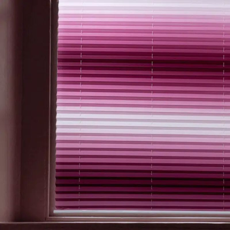 Modern und praktisch Plissees mit einem weiß-dunkelrosa Farbverlauf, 110x135 cm in der Größe. Das Material aus 100 % Polyester bietet vollständige Lichtblockierung und Hitzeschutz. Mit Schnurbetrieb, Montage ohne Bohren und Schrauben möglich. Ästhetische Optik, einfache Reinigung, hervorragende Beschattung Ihres Zuhauses.