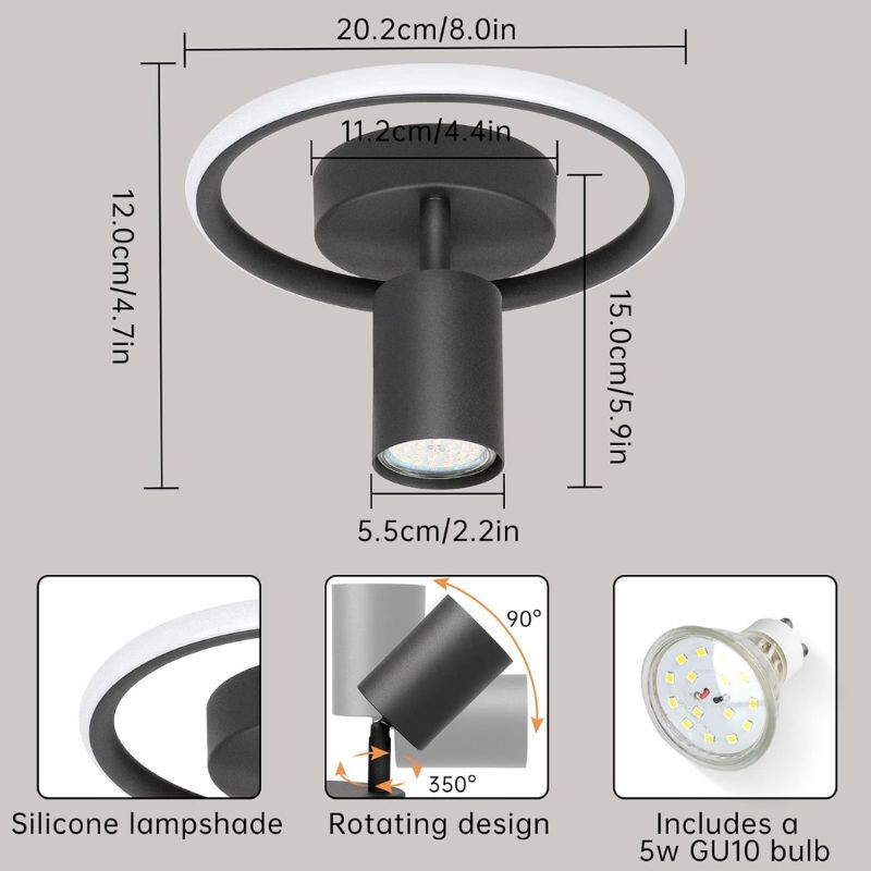 . Hochwertige Materialien: Eine Kombination aus Aluminium und Eisen, die langlebig und widerstandsfähig gegenüber der täglichen Beanspruchung ist.. Modernes, geometrisches Design: Der kreisförmige LED-Ring und der verstellbare GU10-Strahler verleihen dem Raum eine elegante Optik.. Einstellbare Beleuchtung: Die Deckenlampe 180° nach oben und unten, Und Kann um 350° im Kreis gedreht werden, sodass es leicht in die gewünschte Richtung verstellt werden kann.. Leistung und Helligkeit: 12W LED-Ring + 5W GU10 Strahler, insgesamt 17W, mit einer Helligkeit von 1176 Lumen.. Farbtemperatur: 4000K Neutralweiß, die den Raum optimal ausleuchtet, ohne dabei einen zu kalten oder warmen Effekt zu erzeugen.. Einfache Installation: Es kann direkt an der Decke oder Wand montiert werden, eine aufwendige Installation ist nicht erforderlich.. Vielfältige Einsatzmöglichkeiten: Ideale Wahl für Wohnzimmer, Schlafzimmer, Esszimmer, Büro, Flur, Studio oder auch Hotelzimmer Auch.
