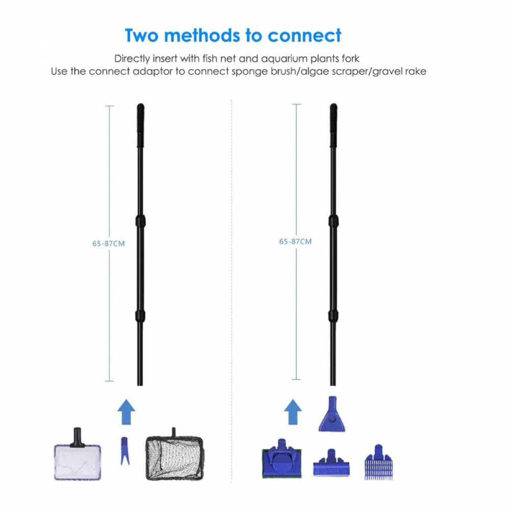 Vielseitiges Aquarium -Reinigungsset: Der Stab kann an den 6 Köpfen befestigt werden. Einfache Montage durch direktes Einstecken in zwei Fischnetze/Pflanzengabeln, mit einem Verbindungsadapter zur Montage eines Algenschabers/Schwammbürste/Kiesrechens.