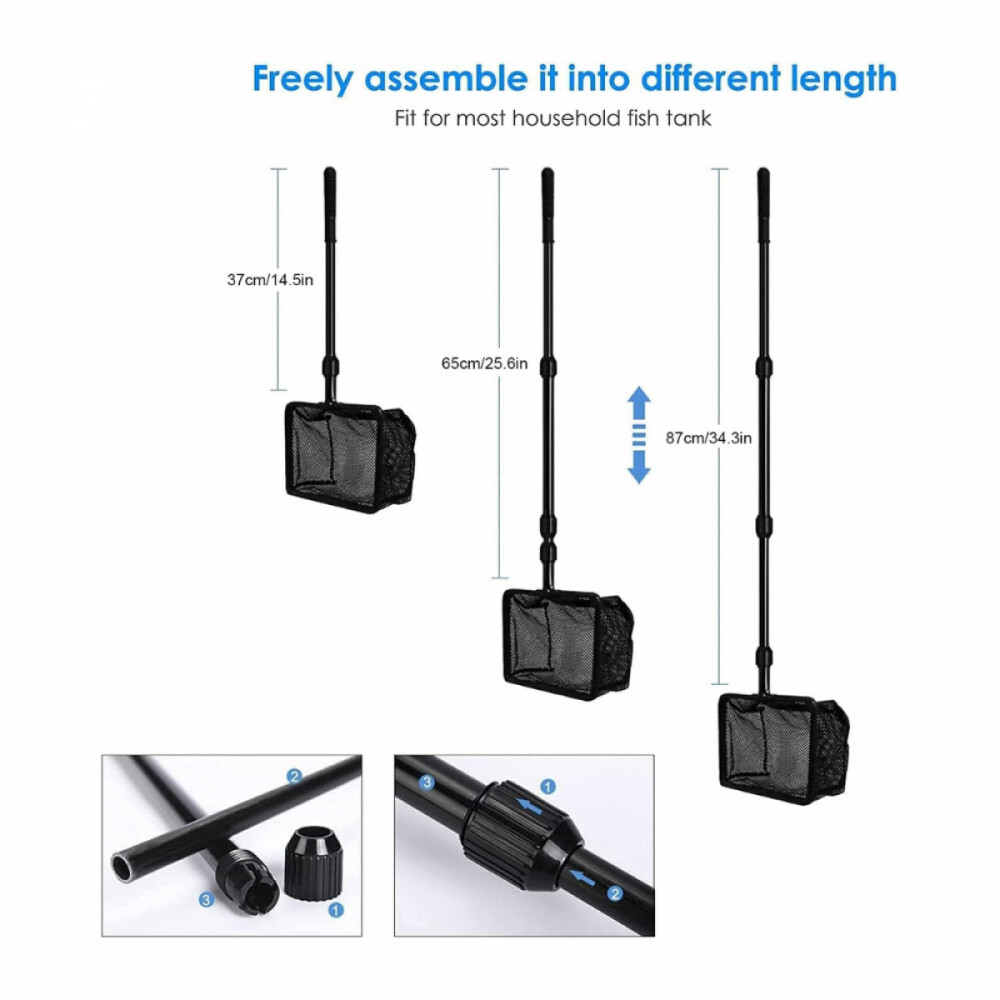 Fischkescher mit ausziehbarer Stange: Mit der speziell entwickelten Teleskopschnalle können Sie die Stangen frei auf verschiedene Längen montieren: 26 cm/10,2Zoll, 65 cm/25,5Zoll, 87 cm/34,2Zoll, geeignet für die meisten Aquarien im Haushalt.