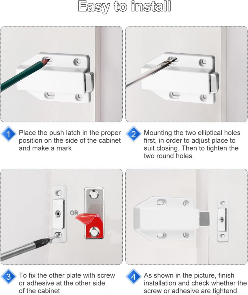 Es ist auch einfach zu installieren. Befestigen Sie zunächst die beiden elliptischen Löcher, um den richtigen Schließpunkt festzulegen. Befestigen Sie dann die Platte mit Schrauben oder Kleber (rote und weiße Versionen sind im Paket enthalten, sie werden nach dem Zufallsprinzip geliefert) in der Schranktür. Sie müssen sich also keine Gedanken darüber machen, den richtigen Ort für die Installation zu finden. Sie können diesen Schiebeverschluss für Küchenschränke, Schubladen, Schränke, Kleiderschränke, Spanplatten, Sideboards, Küchenutensilien und andere Möbel verwenden.