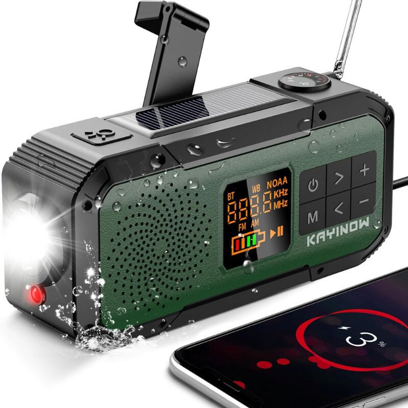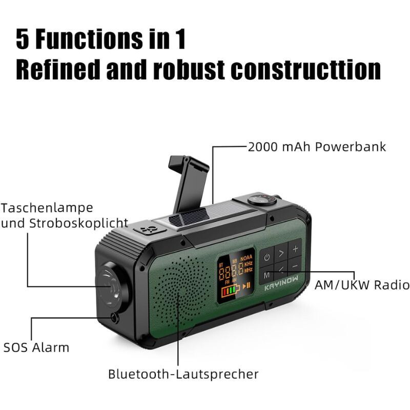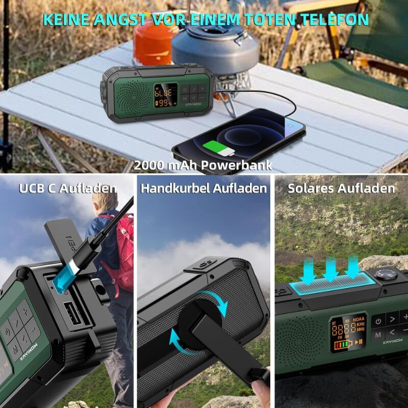 Multifunktionales Notfallwerkzeug für Wanderungen, Camping und Outdoor-Abenteuer , das KAYINOW, ein Kurbel-Solarradio, ausgestattet mit Bluetooth-Lautsprecher, 2000 mAh Powerbank, LED-Taschenlampe und SOS-Alarm. Aufladbar per USB-C, Kurbel oder Solarstrom, IPX5 wasserdichtes Design, ein zuverlässiger Begleiter in allen Notfällen und auf Reisen.