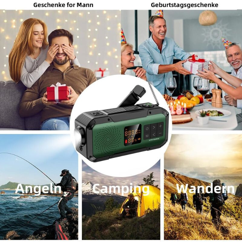 Dies ist die multifunktionales Notfallwerkzeug, vereint die Kurbelradio, Solarladegerät, 2000 mAh Powerbank, Bluetooth-Lautsprecher, LED-Taschenlampe und SOS-Notsignalund bietet somit alle wichtigen Funktionen in einem Gerät. Die dunkelgrüne Farbe, 13, 4× 4, 2× 6, 5cm Das Radio passt problemlos in einen Rucksack, ein Handschuhfach oder eine Tasche.