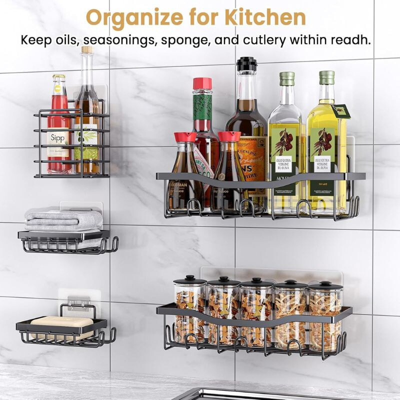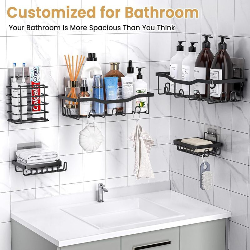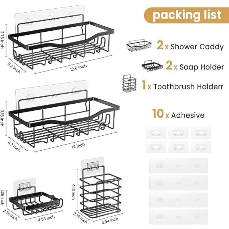 DerPKBD 5-teiliges Duschregalset aus schwarzem Edelstahleine ideale Wahl für alle, die eine praktische, langlebige und elegante Aufbewahrungslösung für ihr Badezimmer oder andere Räume in ihrem Zuhause suchen. Das Set beinhaltet2 Duschablagen, 2Seifenschalen und 1 Zahnbürstenhalter, sowie die zur Montage benötigten Selbstklebekleber, sodass alles sofort einsatzbereit ist.