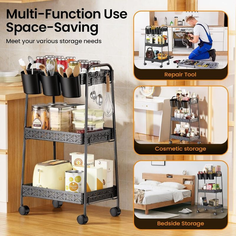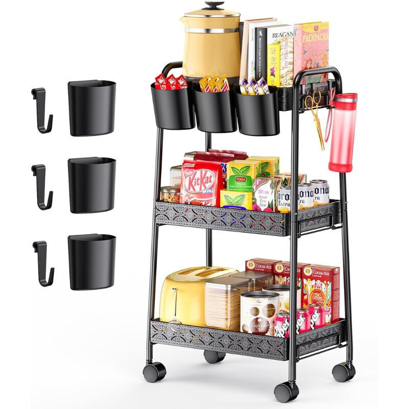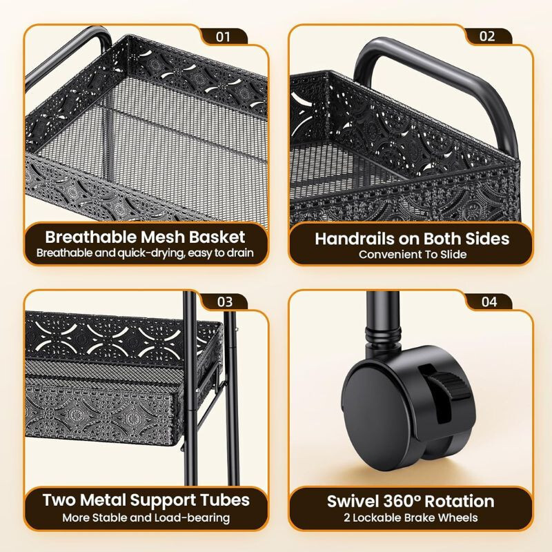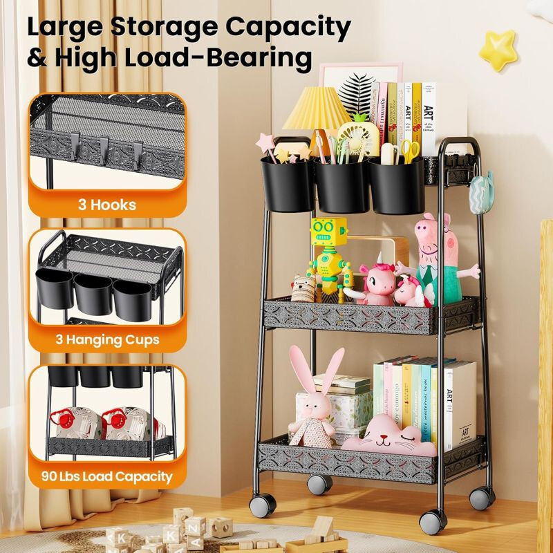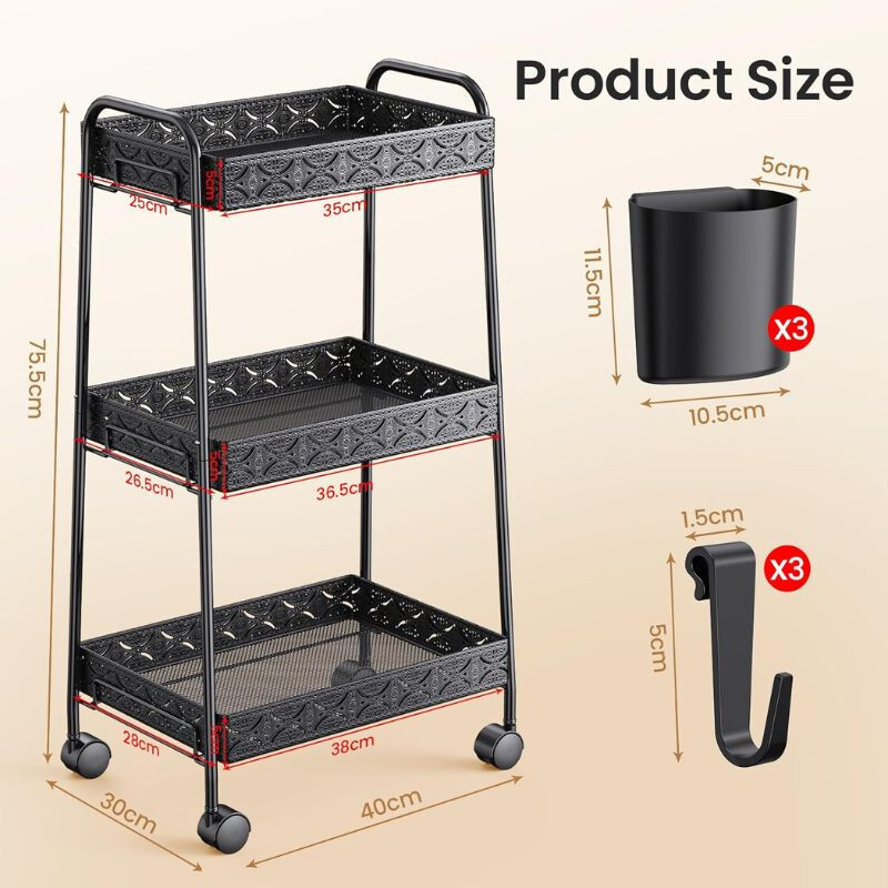 PKBD 3-stöckiger Rollwagen aus Metall, Schwarz, 40 cm x 30 cm x 75, 5cmDER PKBD 3-stöckiger Rollwagen aus Metall, Eine perfekte Wahl für jeden Teil der Wohnung, sei es Küche, Bad, Büro oder Arbeitszimmer. Sein robustes Metalldesign und die moderne schwarze Farbe sind nicht nur eine praktische, sondern auch eine elegante Ergänzung für Ihr Zuhause.Haupteigenschaften:. Solide Metallkonstruktion - Hergestellt aus hochwertigem Metall, das rostbeständig und alltagstauglich ist.. 3-Ebenen-Design - Die drei Regale bieten ausreichend Stauraum zum Ordnen verschiedener Gegenstände.. Gitterböden - Das Netzdesign sorgt für ausreichende Belüftung, sodass gelagerte Gegenstände immer frisch bleiben.. Feststellbare Räder - 360° drehbare Räder ermöglichen eine einfache Bewegung und können bei Bedarf festgestellt werden.. Einfache Montage - Kein Werkzeug erforderlich, kann in wenigen Minuten einfach zusammengebaut werden.. Kompakte Größe - Dank seiner Größe von 40 cm x 30 cm x 75, 5cm ist es eine ideale Wahl für enge Räume.. Moderne Optik - Die schwarze Farbe verleiht Eleganz, sodass es zu jedem Einrichtungsstil passt.Warum sollten Sie sich für den 3-stöckigen Lagerwagen von PKBD entscheiden?Dieser rollende Lagerwagen ist die ideale Lösung, wenn Sie Ihr Zuhause oder Büro organisieren möchten, ohne zu viel Platz zu beanspruchen. Seine langlebige Konstruktion und die einfache Handhabung garantieren langfristige Zufriedenheit und ein aufgeräumtes Umfeld.
