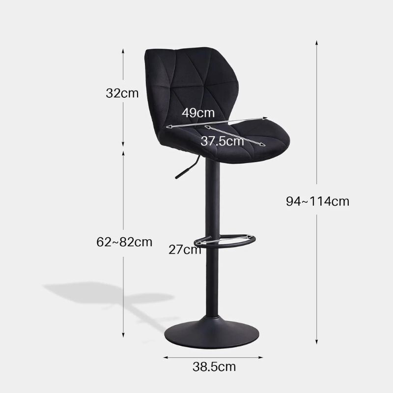 DER Dexter Barhocker Mit stilvoller schwarzer Samtpolsterung und stabilen Metallfüßen garantieren sie bequemes und elegantes Essen. Abmessungen: 49 cm lang, 37, 5cm breit, 94-114 cm hoch, Sitzhöhe: 62-82 cm. Maximale Tragfähigkeit: 150 kg. Höhenverstellbar Und 360° drehbar, ideal für Küchen, Esszimmer oder Bars. Hervorragende Qualität und Design für den langfristigen Einsatz.