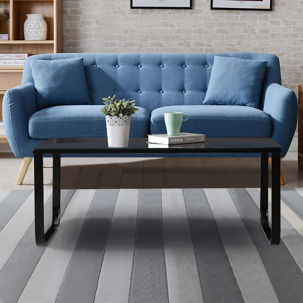 Der schwarze Couchtisch Beulah hat einen modernen Stil, der durch die Kombination von U-förmigen Beinen mit einem Metallrahmen und einer Platte aus gehärtetem Glas besonders wird. Es ist stabil, pflegeleicht und die perfekte Wahl für schlichte, moderne Wohnzimmer oder kleinere Wohnungen.