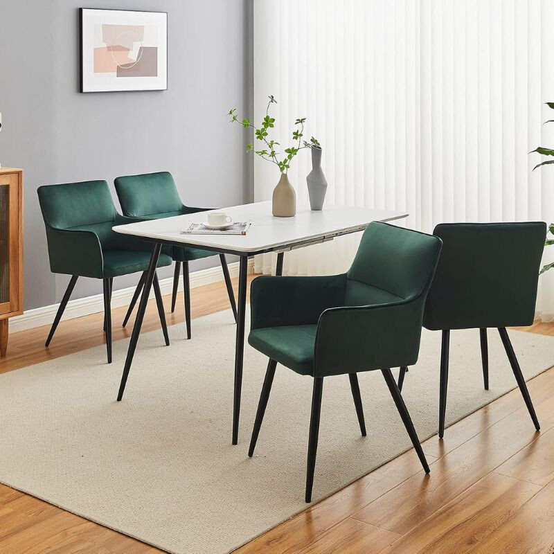 DER CLIPOP Esszimmerstuhl aus grünem Samt (54 x 57 x 84 cm) mit seinem modernen und eleganten Aussehen ist es die perfekte Wahl für Esszimmer, Wohnzimmer, Büro oder Gastronomie. DER weicher Samtbezug und durchgehende Rückenlehne bietet maximalen Komfort, während die solide Metallbeine sie garantieren Stabilität und lange Lebensdauer.