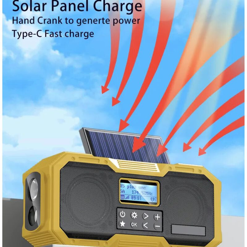 Vielseitiges Radio – AM/FM/WB/NOAA-Empfang, sodass Sie auch Wetter- und Notfallinformationen empfangen könnenBluetooth-Lautsprecher – 15 W Leistung, System mit zwei Lautsprechern (8-Zoll-Tieftöner + 3,5-Zoll-Hochtöner), TWS-Stereosound, EQ-ModusStromversorgung – Eingebauter 4000 mAh-Akku, Solarladung, schnelles USB-Laden (5 V/2 A), Notstromerzeugung per HandkurbelNotfall- und Überlebensfunktionen – SOS-Alarm, digitales Thermometer, KompassBeleuchtung – Leistungsstarke LED-Taschenlampe mit 3 Helligkeitsstufen und LeselichtmodusLanglebiges Design – Robustes Kunststoffgehäuse, IP65 wasserdicht für den Einsatz im AußenbereichVerwenden – Handy, Audioplayer, Wandern, Camping, Zuhause, im Auto oder im Notfall