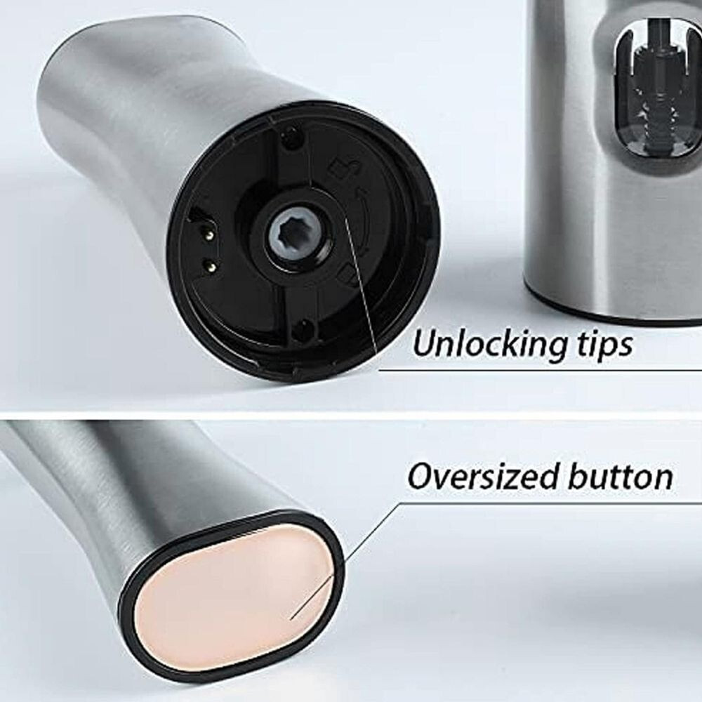 Dieser elegante und stilvolle elektrische Pfeffer- und Salzmühle ist die perfekte Ergänzung für Ihre Küche und besteht aus hochwertigem Edelstahl und Acrylmaterialien. Die Einhandbedienung vereinfacht die Zubereitung der Mahlzeiten, sodass Sie mit nur einem Knopfdruck frische Gewürze mahlen können. Der durchsichtige Behälter ermöglicht eine einfache Einstellung der Mahlgradstärke, sodass Sie das Salz oder den Pfeffer ganz nach Ihren Bedürfnissen mahlen können.