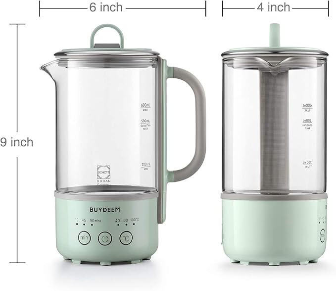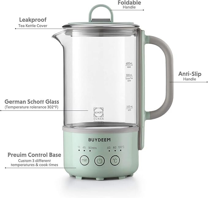 - Der moderne Look und das schlanke Design passen perfekt zu jedem Einrichtungsstil. Es kann auch ein ausgezeichnetes Geschenk für Ihre Familie und Freunde sein.- ULTRALEICHTES UND TRAGBARES DESIGN - Dank des ultraleichten Designs können Sie unseren Wasserkocher sicher in jede Stadt mitnehmen. Perfekt für den Einsatz in Schlafsälen, zu Hause, beim Camping, auf Reisen, im Büro, in Hotels und an vielen anderen Orten. Genießen Sie heißen Tee, Kaffee, Milch und mehr – wo immer Sie sind.- EINFACHE HANDHABUNG - Entwickelt mit echter One-Touch-Premium-Temperaturregelung und einer automatischen 8-Stunden-Warmhaltefunktion, mit der Sie die gewünschte Temperatur vollständig steuern können. Sie können bis zu 0, 6Liter kochen, um jederzeit mit heißem Wasser versorgt zu sein.- PRÄZISE KOCHKONTROLLE - Ob Tee, Kaffee, Kakao oder sogar eine Schüssel Brei, der Mini-Wasserkocher BUYDEEM K313 ermöglicht ein präziseres und effizienteres Kochen und bewahrt gleichzeitig den Nährwert und den ursprünglichen Geschmack der Zutaten.- LANGLEBIGE UND SICHERE VERWENDUNG - Deutsches Schott Duran-Glas und lebensmittelechter 18/10-Edelstahl sorgen für die Langlebigkeit unseres Wasserkochers mit FDA-Zertifizierung. Der Trockenschutz sorgt dafür, dass der Wasserkocher abschaltet, wenn die Kanne leer ist.