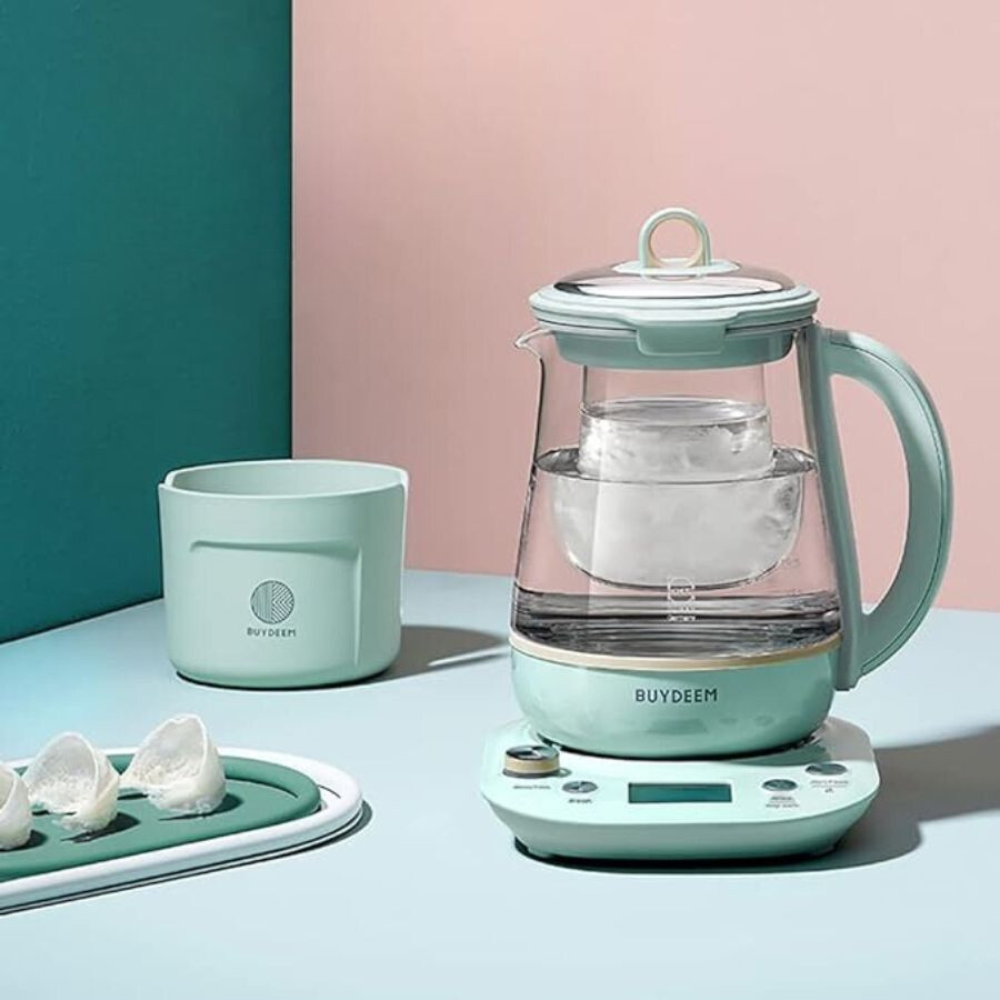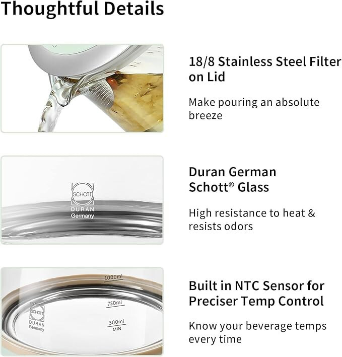 Marke: BuydeemFarbe: HellgrünBesondere Merkmale: Abnehmbarer Kochtopf, 6 voreingestellte WassertemperaturenVerpackungsinformationen: TopfOberflächenart: PoliertKapazität: 1,5 LiterMaterial: Schottglas, 316L EdelstahlSpannung: 120VLeistung: 1000W