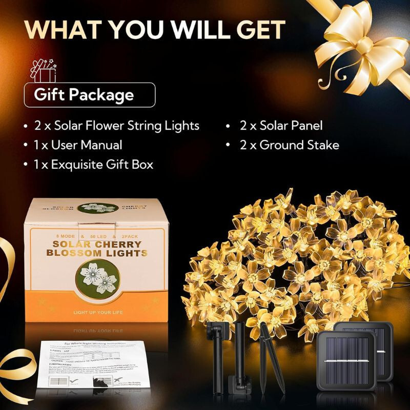 Solarbetriebene Kirschblüten-LED-Lichterkette, die Ihre Umgebung mit echten leuchtenden Blumen zu verschönern scheint.