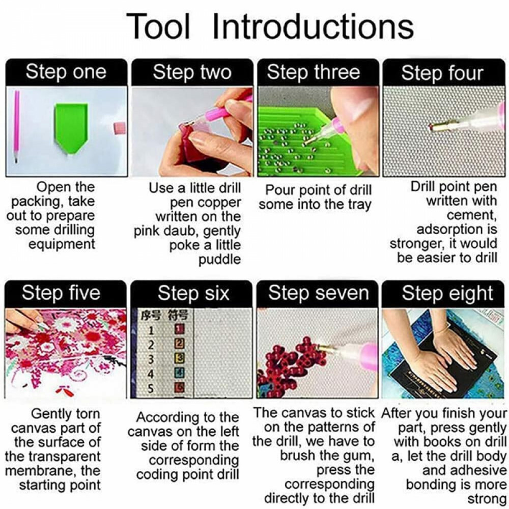 Schritte zum Diamantmalen:1. Nehmen Sie das Diamant-Malset heraus!2. Legen Sie die Diamanten in die Schale und schütteln Sie sie!3. Schauen Sie sich die Tabelle auf der Leinwand an, um die richtigen Diamantperlen zu finden!4. Tragen Sie die richtige Menge Kleber auf den Stift auf!5. Kleben Sie den richtigen Diamanten auf!6. Kleben Sie den Diamanten vorsichtig auf die entsprechende Stelle der Leinwand!7. Drücken Sie die Diamanten mit einem Buch auf die Leinwand, um sie zu fixieren!