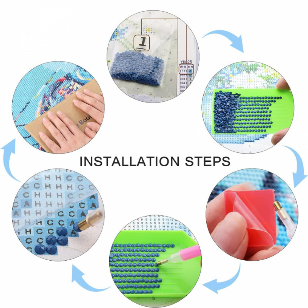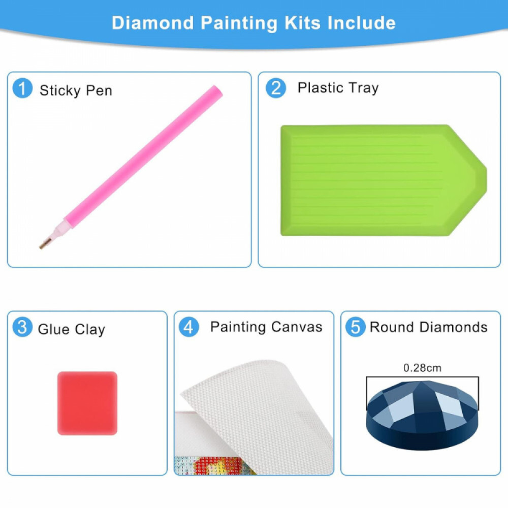 Schritte zum Diamantmalen:1. Nehmen Sie das Diamant-Malset heraus!2. Legen Sie die Diamanten in die Schale und schütteln Sie sie!3. Sehen Sie sich die Tabelle auf der Leinwand an, um die richtigen Diamantperlen zu finden!4. Tragen Sie die richtige Menge Kleber auf den Stift auf!5. Kleben Sie den richtigen Diamanten auf!6. Kleben Sie den Diamanten vorsichtig auf die entsprechende Stelle der Leinwand!7. Drücken Sie die Diamanten mit einem Buch auf die Leinwand, um sie zu fixieren!