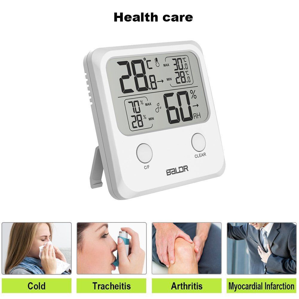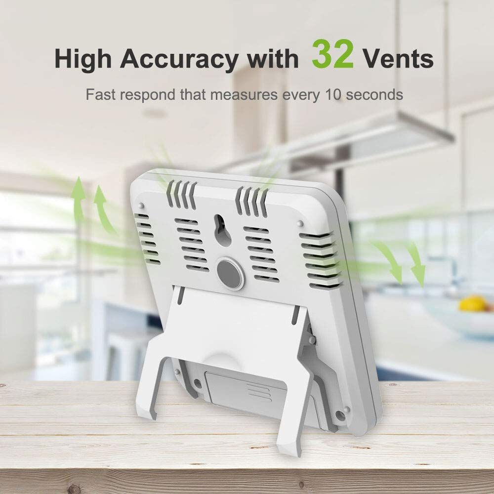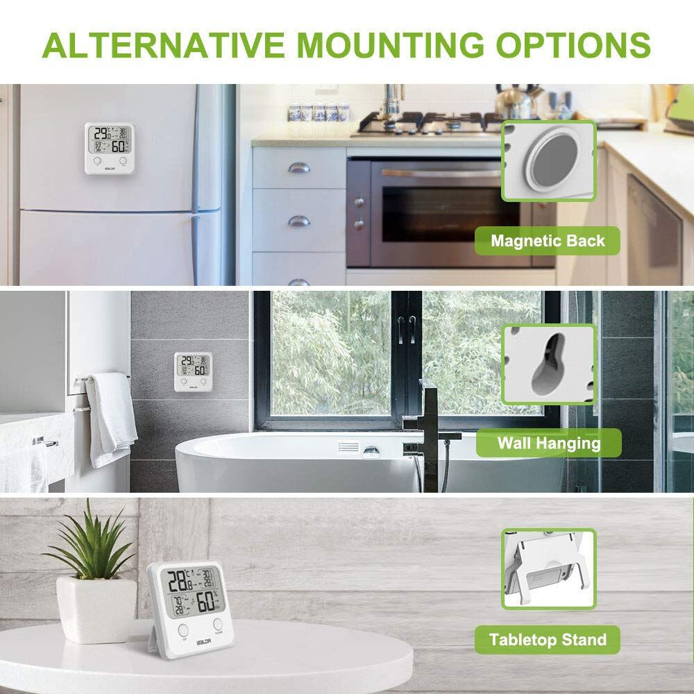 Es kann auf verschiedene Arten behoben werden, z.B. Wandmontage, magnetische Rückseite usw. Dieses vielseitige Design ermöglicht den Einsatz des Messgeräts in der Küche, im Garten, im Kinderzimmer, im Keller, im Auto oder sogar im Büro. Funktioniert mit 1 AAA -Batterie (nicht enthalten) .