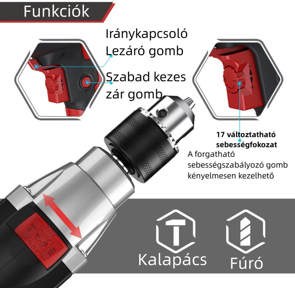 Die Schlagbohrmaschine von Meterk ist multifunktional: Mit der oberen Taste können Sie ganz einfach zwischen Hammer- und Bohrfunktion wechseln.