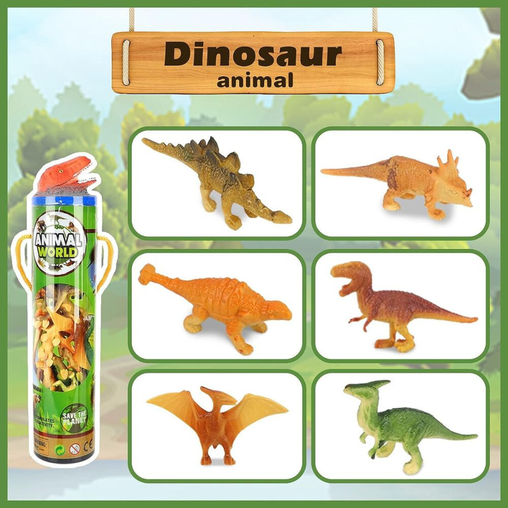 Die sechs bunten Röhren enthalten Figuren verschiedener Kategorien: Dinosaurier, Waldtiere, Meerestiere, Reptilien, Nutztiere, Insekten.