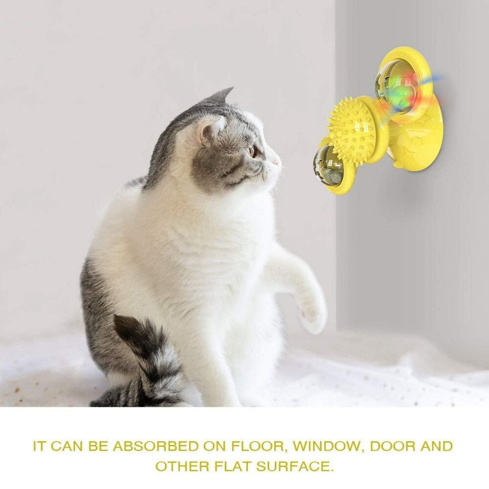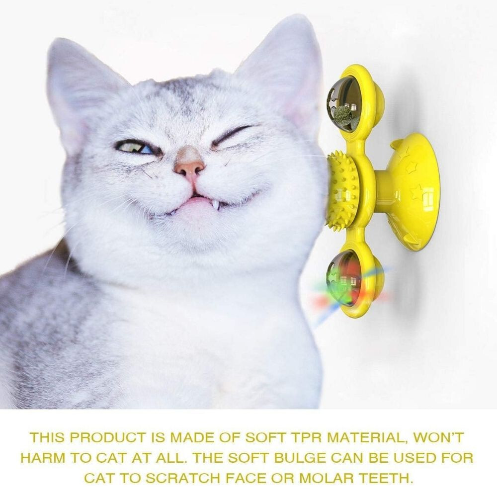 Windmühlen -Katzenspielzeug mit Katzenminze, Saugnapf und Massagekopf.