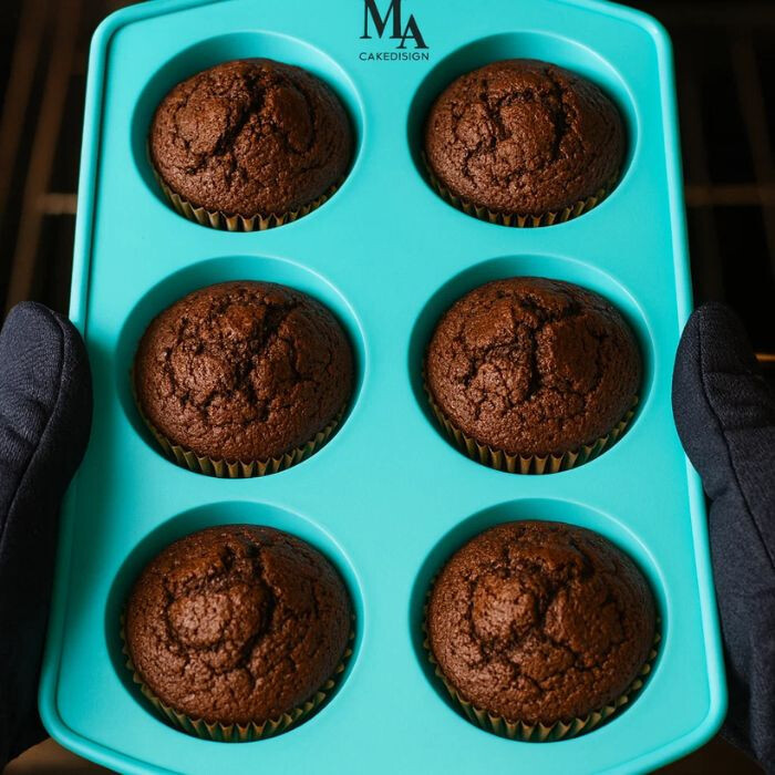 Antihaftbeschichtete Silikon-Kuchenform, hauptsächlich zum Backen von Muffins und Cupcakes, aber auch für die Zubereitung anderer kreativer Gerichte geeignet. Pastellblaue Farbe.