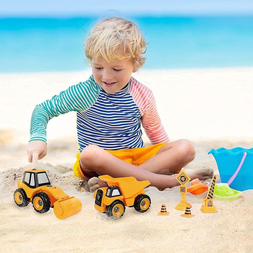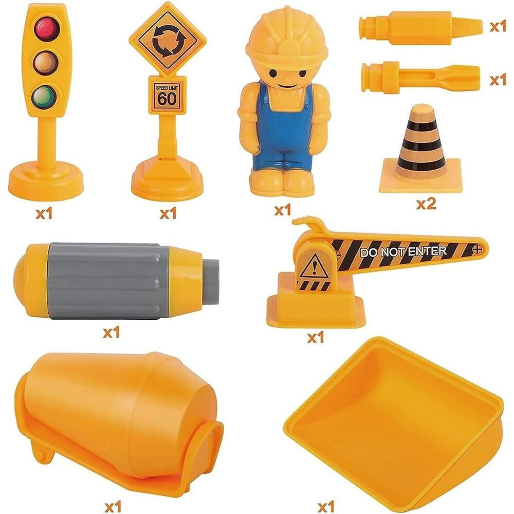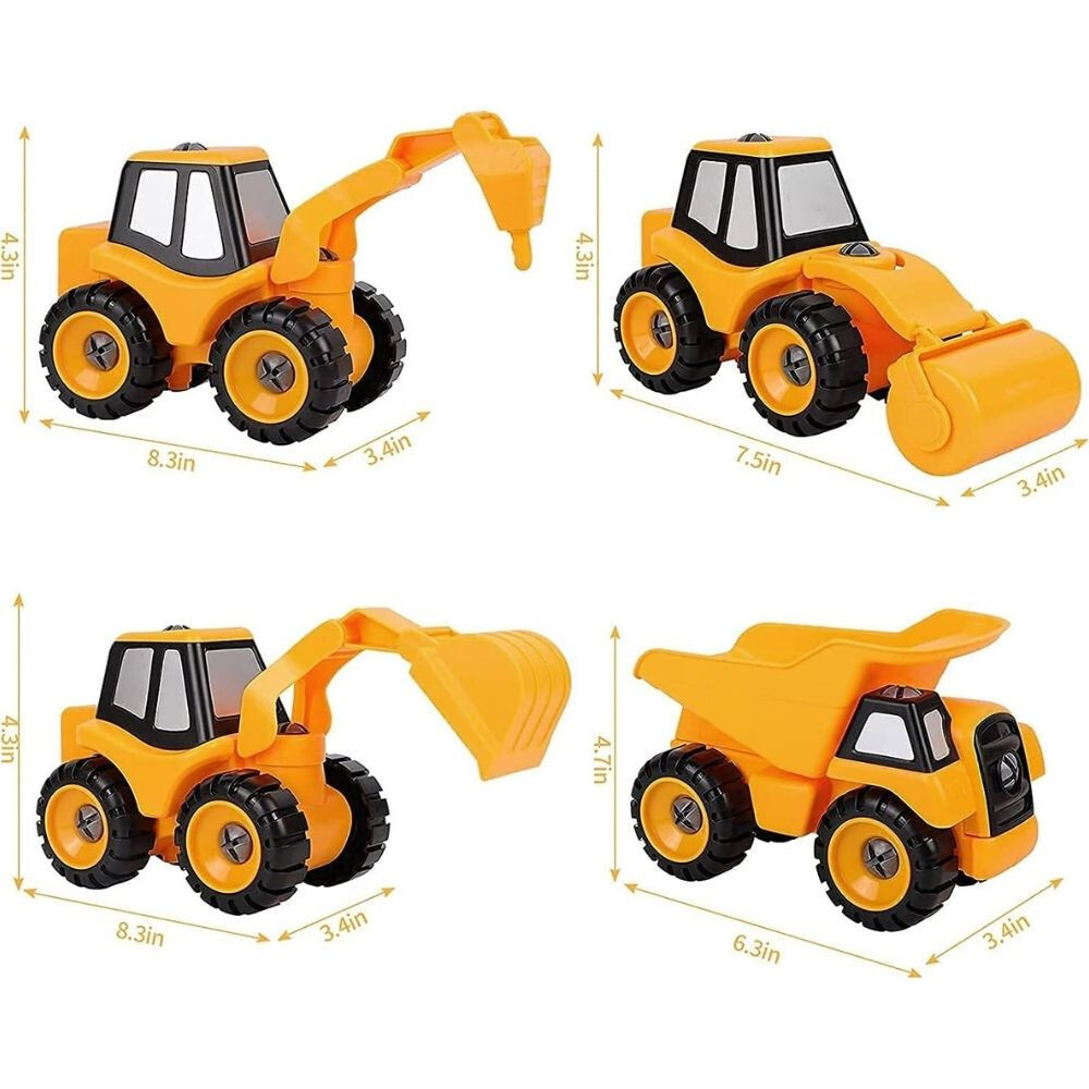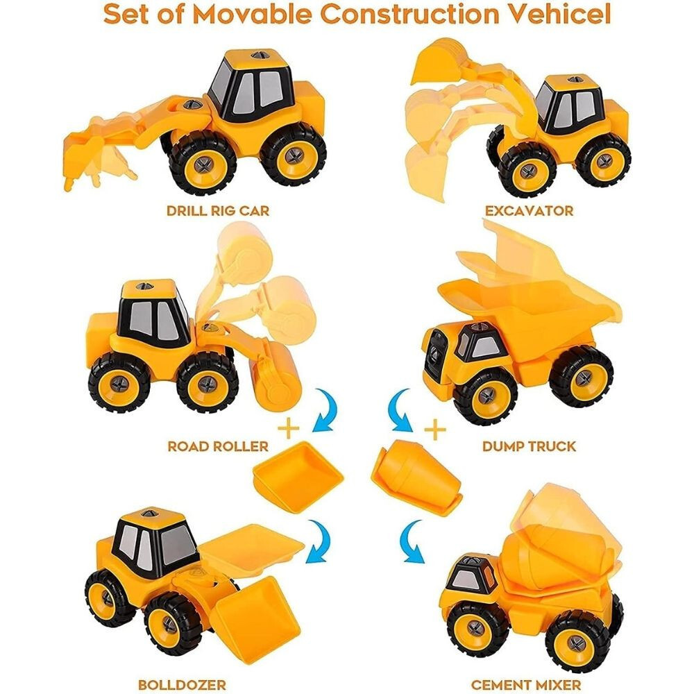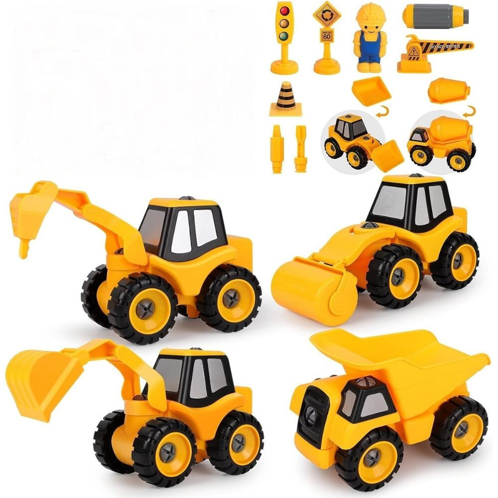 Das Spielzeugset enthält 4 zerlegte Baufahrzeuge (Bagger, Lader, Straßenwalze, Bohrmaschine), die Kindern dabei helfen können, ihre praktischen Fähigkeiten und Kreativität zu entwickeln. Es enthält außerdem eine Bedienungsanleitung, Modellzubehör und Verkehrsschilder.