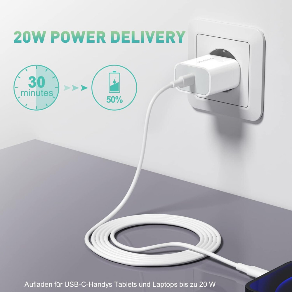20 W PD-Schnellladegerät: Das Amoner 20W USB-C-Netzteil unterstützt PD 3.0-Schnellladung und kann ein neues iPhone/Pad in 30 Minuten von 0 auf 50 % aufladen. 3X schneller als das Original-5V/1A-Ladegerät.