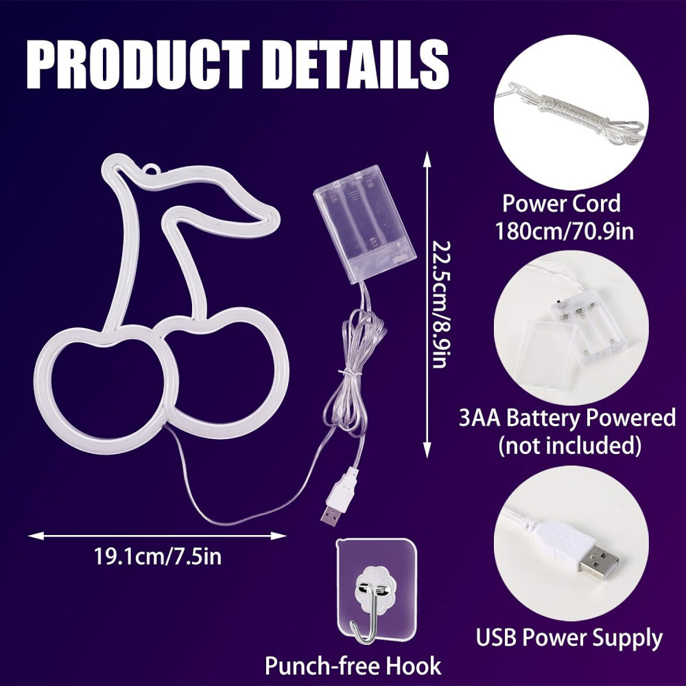 [Kirsch-Neonschild] – Kirsch-Neonschilder (8,07 Zoll * 7,28 Zoll) für die Schlafzimmerdekoration. Die Leuchtreklame mit grünen Blättern und die Leuchtreklame mit roten Kirschen sind perfekt kombiniert, um eine besondere Umgebung zu schaffen und eine warme und romantische Atmosphäre zu schaffen. Im Vergleich zu herkömmlichen Neonlichtern ist das Licht weicher und gleichmäßiger. Darüber hinaus ist die Leuchtreklame im eingeschalteten Zustand geräuschlos.