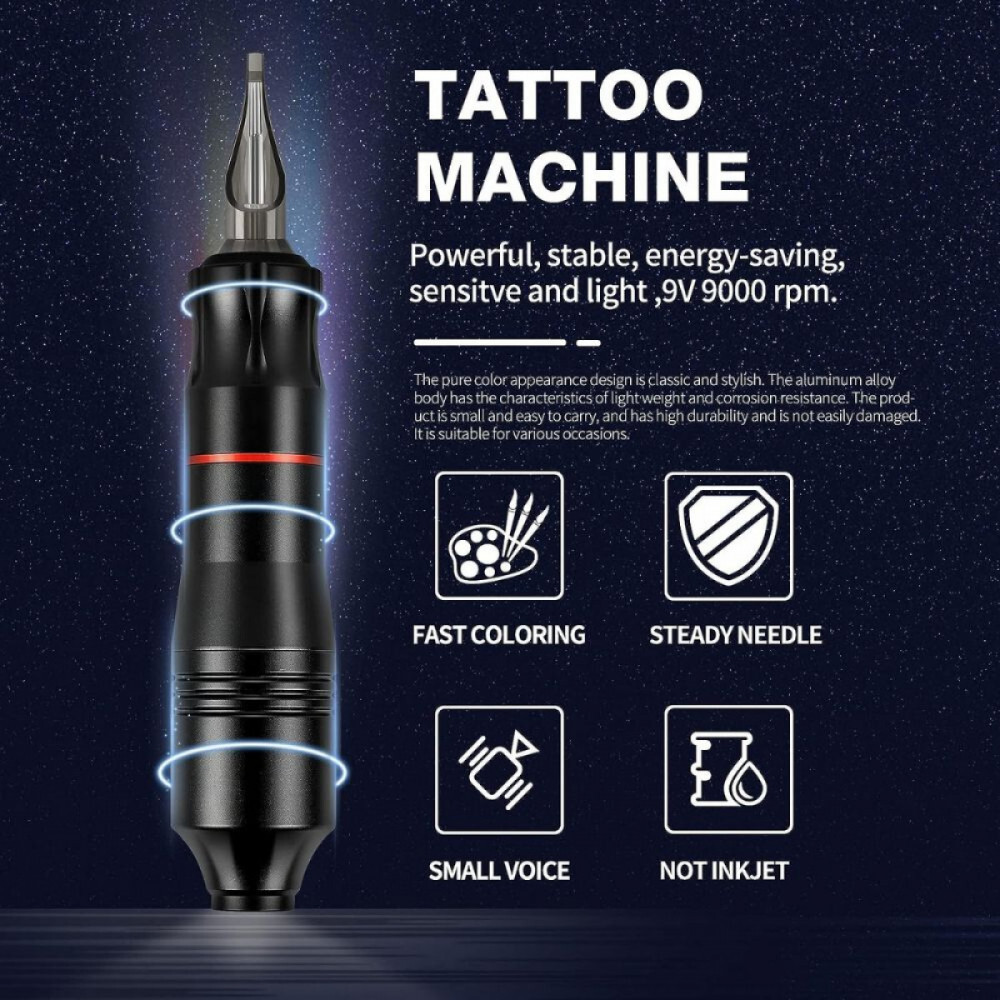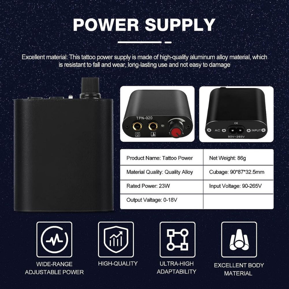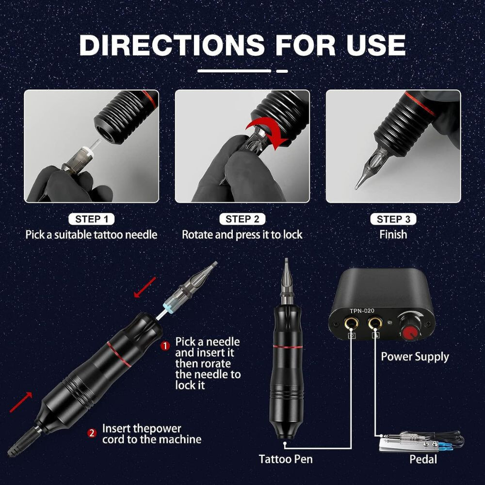 Im Lieferumfang des Tattoo-Sets ist ein Koffer enthalten, der viel Platz bietet. Es kann zum Transport dieses Tattoo-Sets verwendet werden, das zusätzliches Zubehör und Tinten aufnehmen kann.