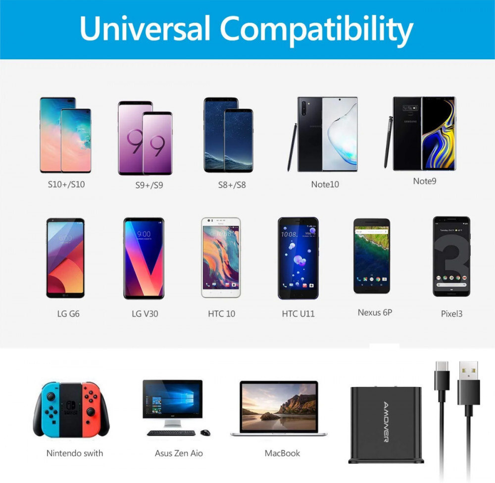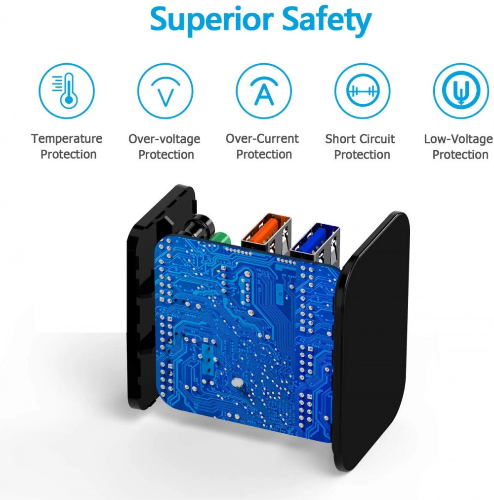 Zwei USB-Anschlüsse -- Ein Port unterstützt den 5V/2A-Ausgang, während der andere die QC2.0-Technologie mit 5V/3A, 9V/1,67A-Werten unterstützt. Die maximale Leistung kann 25 W erreichen. Sie können zwei Geräte gleichzeitig laden.
