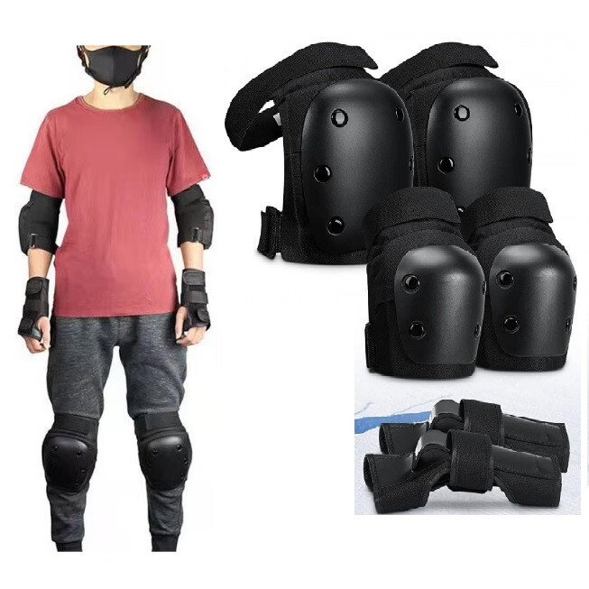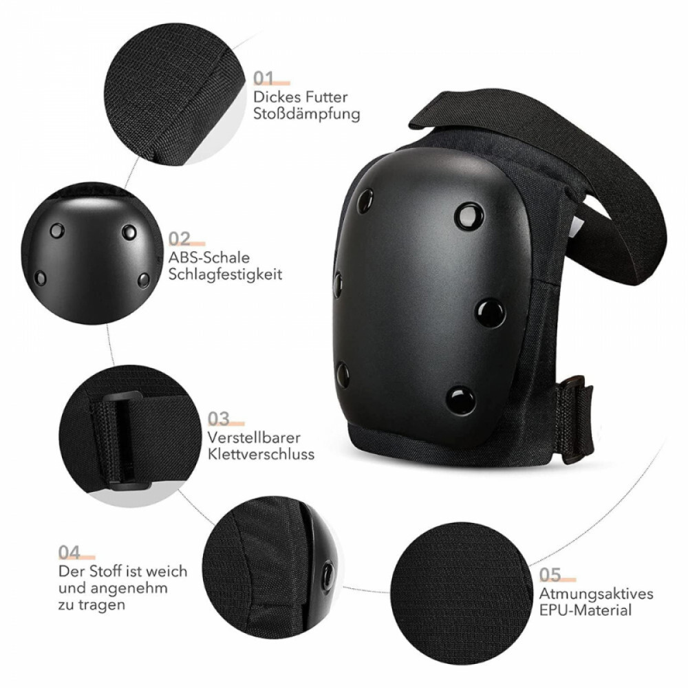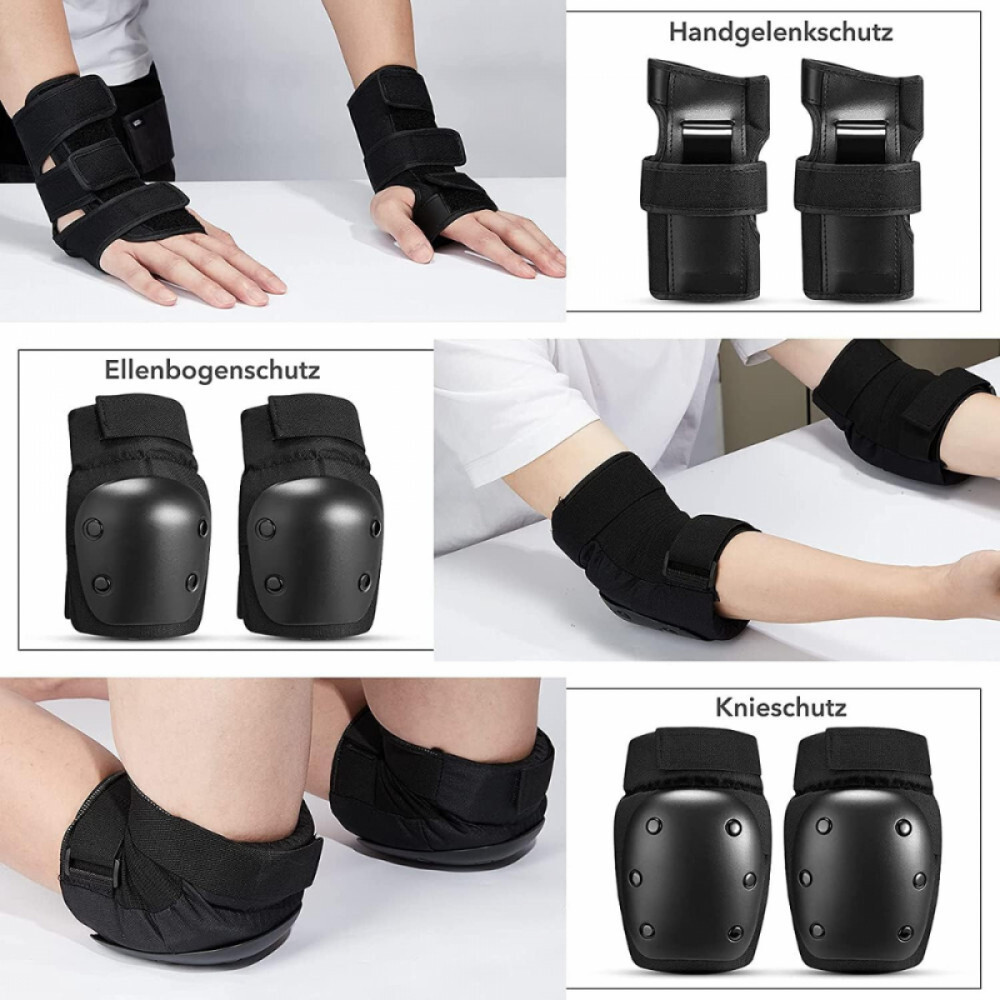 6-in-1-Schutzausrüstung, bestehend aus: 2x Ellbogenschützer, 2x Knieschützer, 2x Handgelenkschützer, 1x Aufbewahrungstasche.Geeignet für Outdoor-Sportarten, Rollschuhlaufen, Eislaufen, Skateboarden, Eislaufen, Rollschuhlaufen, Skifahren und andere Extremsportarten.Vielseitig einsetzbar: Ellbogenschützer, Knieschützer und Handgelenkstützen, reduziert Reibung und Stöße und schützt die Bänder bei intensiven Übungen. Geeignet für Rollschuhlaufen, Eislaufen, Skateboarden, Skaten, Rollerfahren, Skifahren und andere Extremsportarten.Sicher und stoßfest: Das Innenfutter besteht aus schweißabsorbierendem Material, das für eine gute Dämpfung sorgt und Schmerzen beim Fallen lindert. Die halbrunde, konvexe Form des Ellenbogenpolsters schützt die Handballenauflage und den Knieschutz besser, und die Handschützer sind von einem 360-Grad-Design mit dreizackigem Klettverschluss umgeben, zwei speziell entwickelten PP-Kunststoffteilen innen und außen, die sich anpassen an die Handfläche und sorgt für starken Schutz.Zwei Tragemöglichkeiten: Die Hände können in voller Größe umwickelt werden, sodass sie während des Trainings nicht so leicht herausfallen, wodurch potenzielle Sicherheitsrisiken vermieden werden. Es kann im Riemchenstil getragen werden: Es ist einfach zu tragen, für Training und Wintersport, es lässt sich bei dicker Kleidung einfach an- und ausziehen, was bequem und schnell geht.Verstellbare Polster: Mehrere verstellbare elastische Riemen und Klettverschlüsse sorgen für individuelle Flexibilität bei der Anpassung der Enge.Größe MMaterial: KunststoffFarbe schwarzGröße: 37 x 26 x 13 cmGewicht: 560 g
