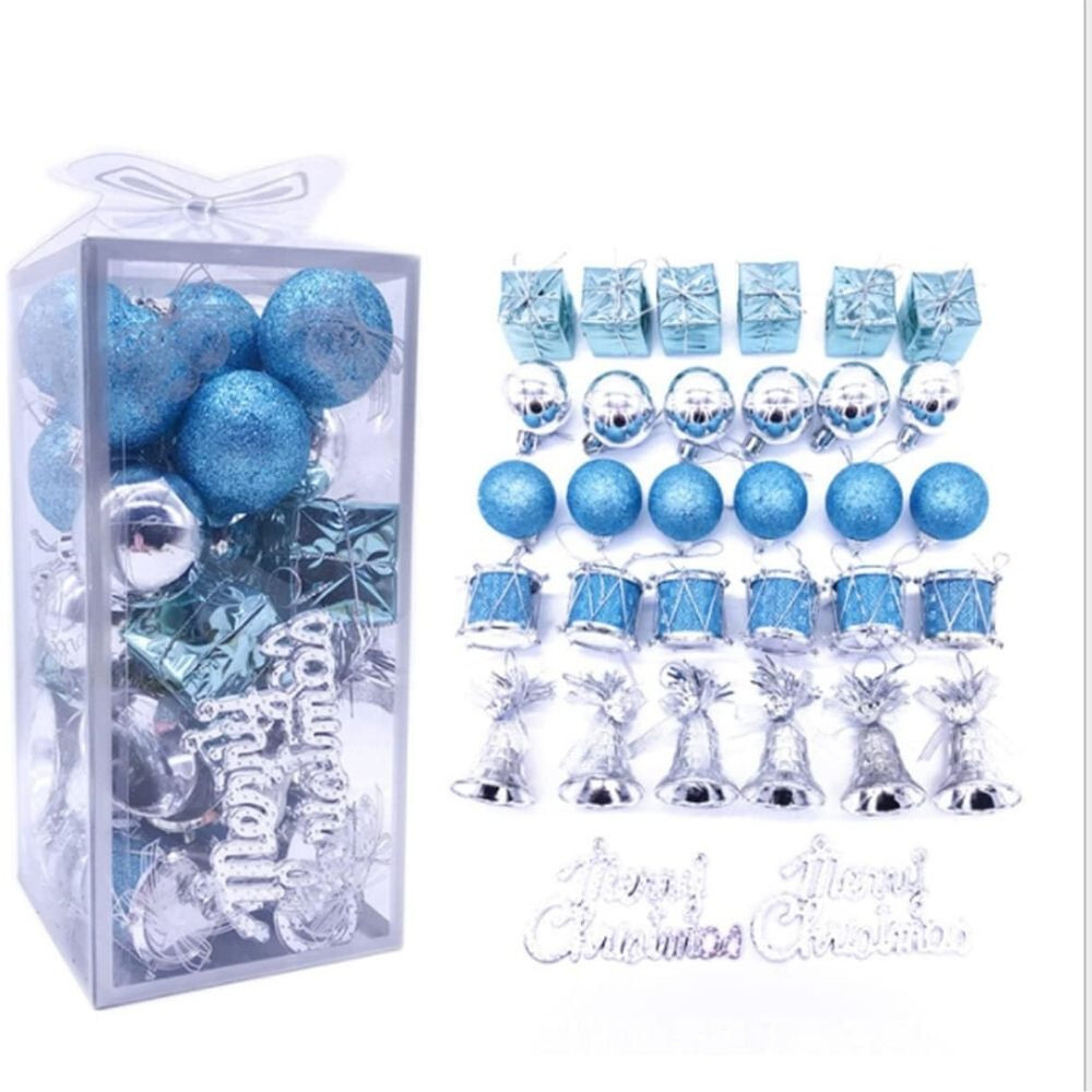 Das 64 -teilige Set besteht aus zwei verschiedenen Sets, eines in Blau-Silber, das andere in Rot-Gold. Zu den Formularen zählen z.B. schlichte Kugeln, Geschenkboxen und Glocken. Das Material ist langlebig und nicht zerbrechlich.