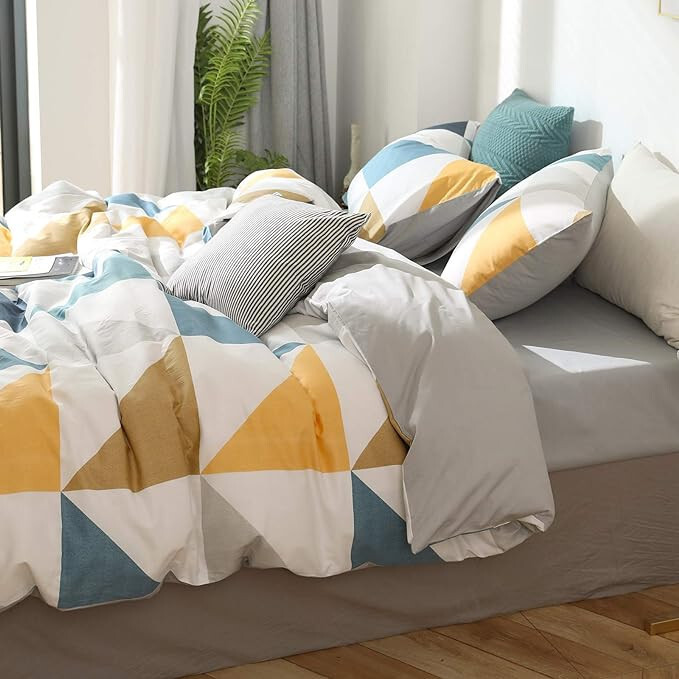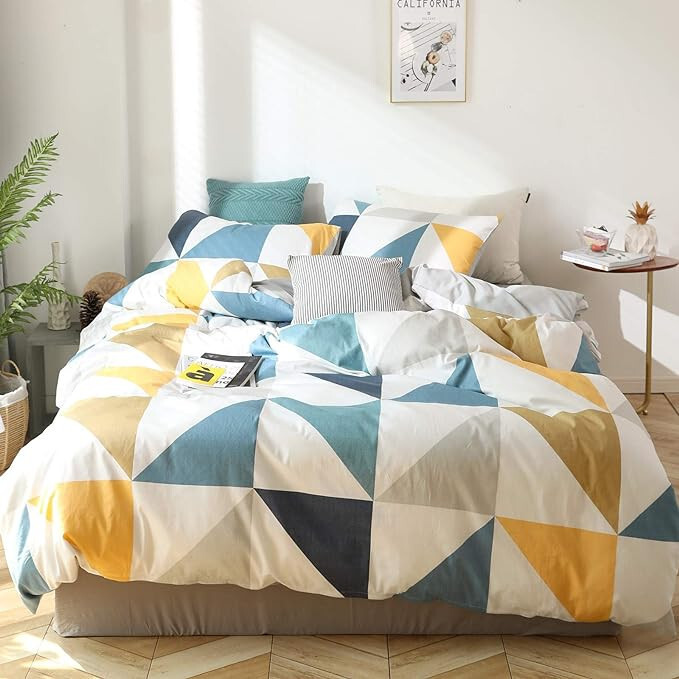Blau-gelbes geometrisches Muster, einfaches Bettbezug-Set aus 3 Teilen,
