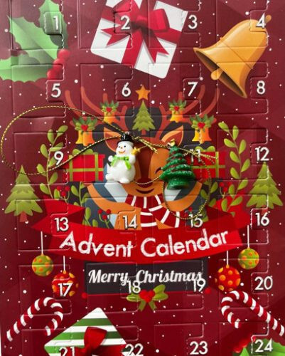 Der Kalender enthält kleine Weihnachtsfiguren, die an einen Baum gehängt werden können.