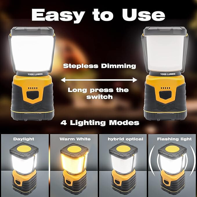 LED-Campinglicht: Das transparente PC-Gehäuse der Lampe hat eine maximale Helligkeit von 1000 Lumen und einen horizontalen Abstrahlwinkel von 360°. Sie strahlt ein weiches, blendfreies Licht aus und bietet ausreichend Licht für Outdoor-Aktivitäten oder plötzliche Stromausfälle.