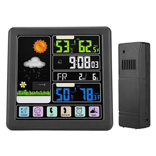 Das TS-3310 drahtlose farbige LCD-Thermometer ist ein Gerät zur Messung der Innen- und Außentemperatur, Luftfeuchtigkeit sowie zur Wettervorhersage. Mit dem Touchscreen-Display und der eingebauten Weckuhr bietet das Gerät komfortable und präzise Informationen für den täglichen Gebrauch. Farbe: Schwarz.