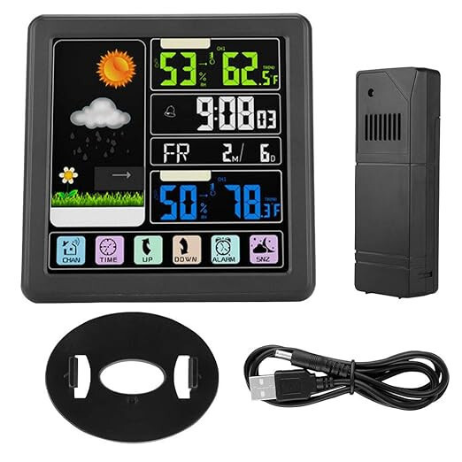 Dieses multifunktionale Wettervorhersagegerät verfügt über einen USB-Anschluss, sodass es problemlos angeschlossen und mit Strom versorgt werden kann. Das hochwertige Gerät aus Acrylonitril-Butadien-Styrol (ABS) sorgt für Langlebigkeit und eine lange Lebensdauer. Das vollfarbige LCD-Display des Geräts eignet sich nicht nur zur Messung von Temperatur und Luftfeuchtigkeit, sondern auch zur Wettervorhersage, mit verschiedenen Symbolen: sonnig, teilweise sonnig, bewölkt, regnerisch, stürmisch und schneitend.