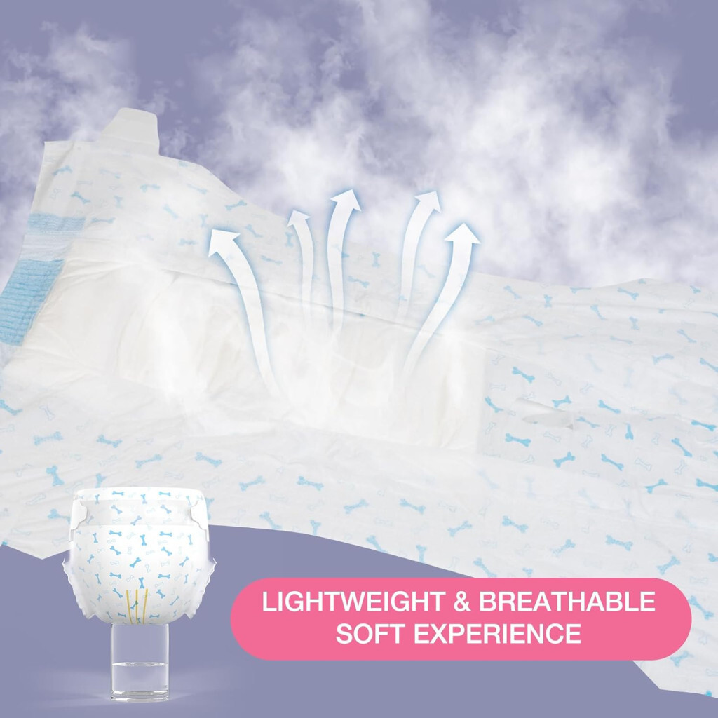 ATMUNGSAKTIVE WEICHHEIT: Komfort ist auch für uns von zentraler Bedeutung. Die Außenschicht besteht aus einer perforierten, atmungsaktiven Rückseite und die gute Atmungsaktivität sorgt für den Komfort Ihres Haustieres. Fellfreundliche Verschlüsse und leichte Windeln sorgen dafür, dass Ihr Hund keine Fremdkörper spürt und unbeschwert spielen kann.