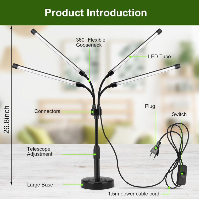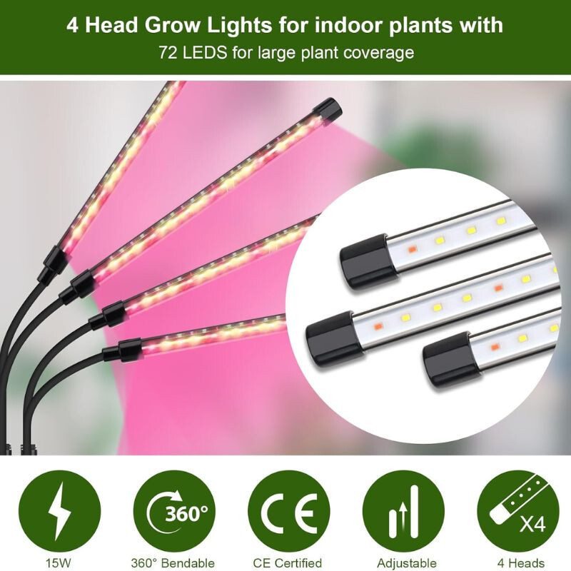Volles Spektrum LED Pflanzenlicht Mit 4 Köpfen und 72 hochhellen LEDs ist es die ideale Wahl für den Pflanzenanbau im Innenbereich. Der verstellbarer Schwanenhals und die energiesparende Bauweise sorgt für das richtige Licht in jeder Wachstumsphase. Perfekt für Sukkulenten, Kräuter, Gemüse und Topfpflanzen.